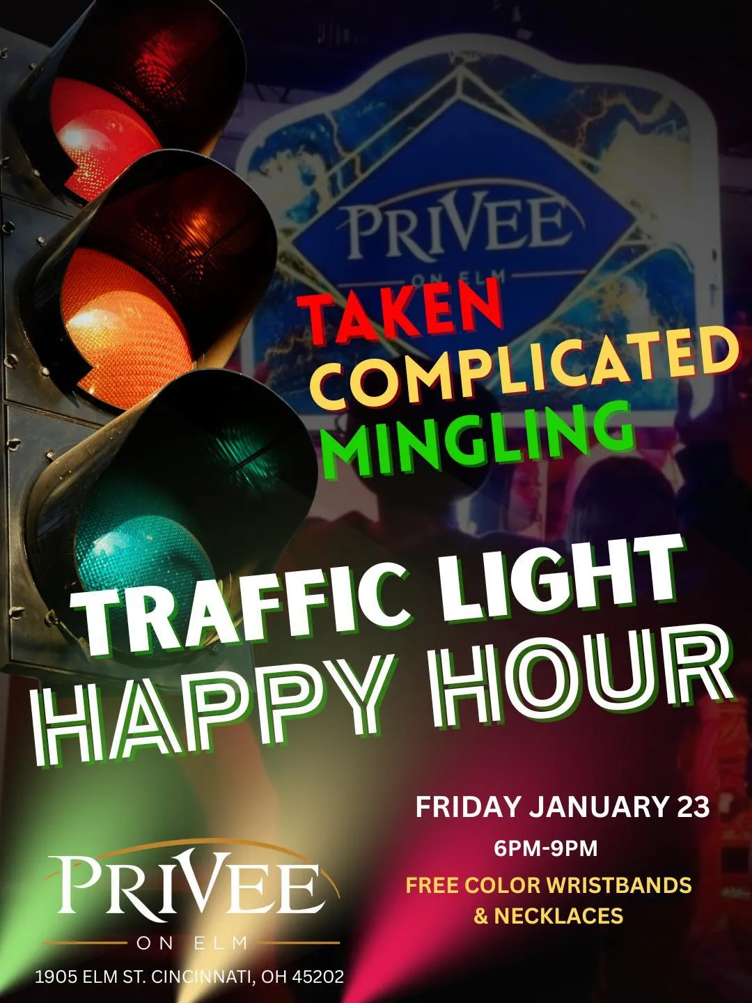 Join us at Privee on Elm for Traffic Light Happy Hour, a fun and social night designed for mixing, mingling, and meeting new faces. The event takes place on Friday, January 23, from 6:00 PM to 9:00 PM at 1905 Elm St., Cincinnati, OH 45202. Guests will receive free color wristbands and necklaces, letting everyone know whether you’re taken, complicated, or ready to mingle—just like a traffic light. Whether you’re coming with friends or flying solo, this lively happy hour sets the mood for great conversations, music, and an energetic nightlife atmosphere in the heart of the city.
